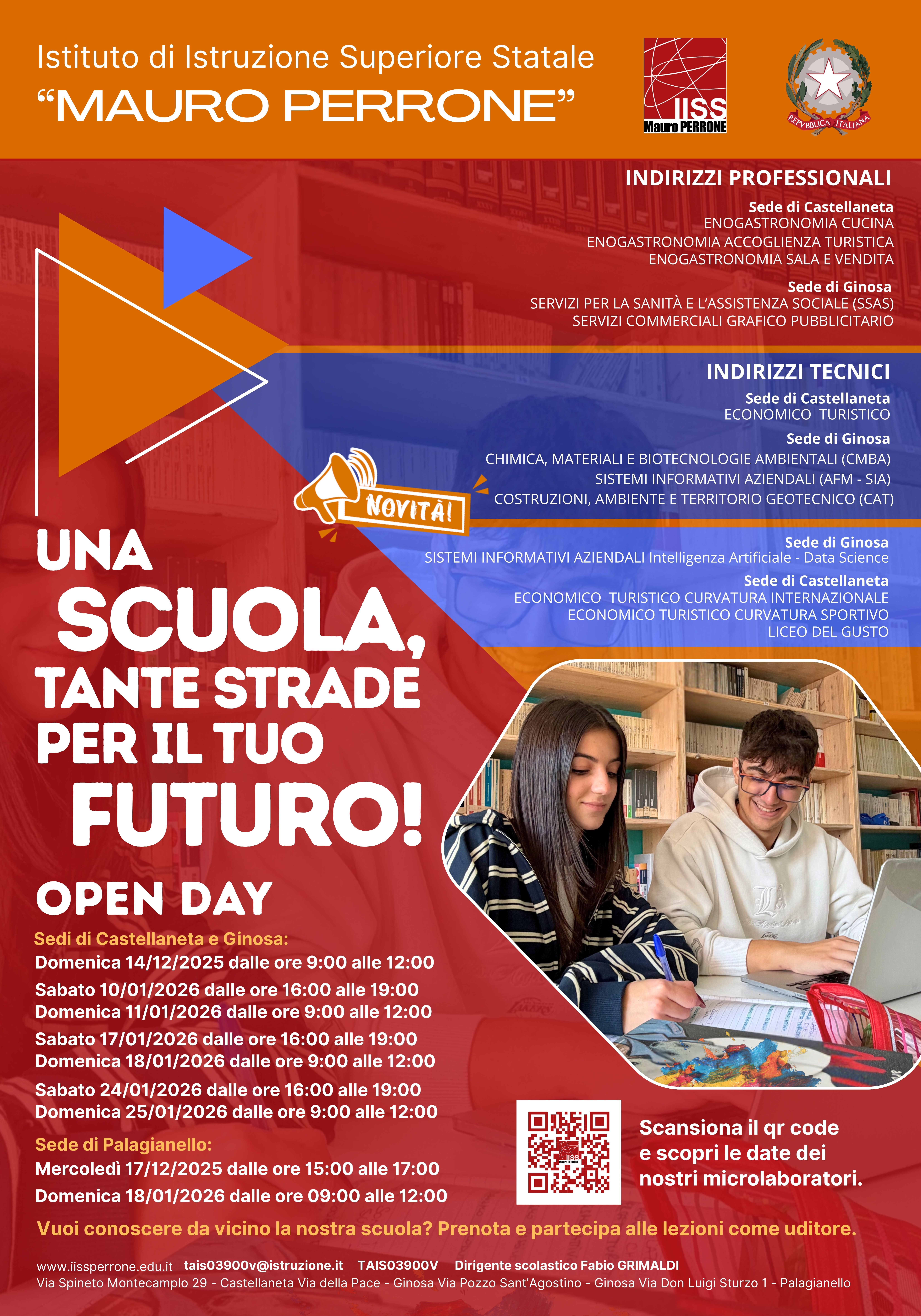 Il nostro Istituto è lieto di comunicare il calendario con le date degli OPEN DAY delle sedi di Castellaneta, Ginosa, Palagianello.